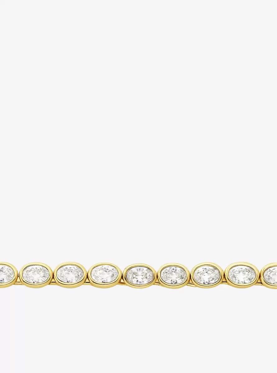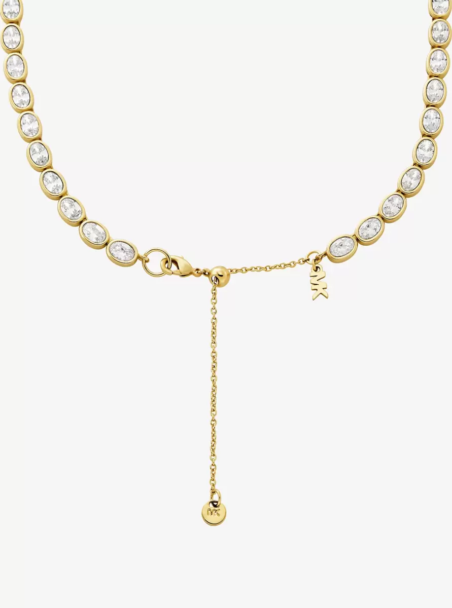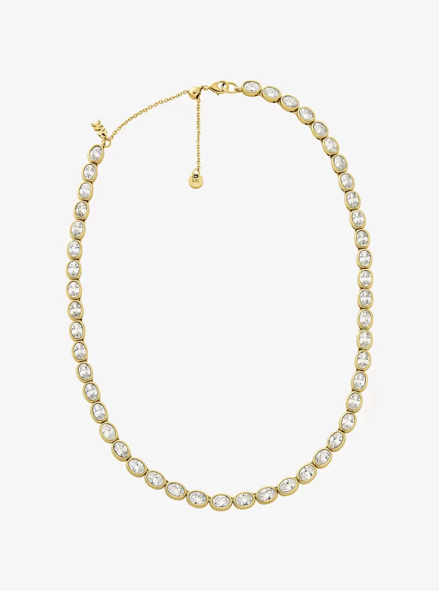 Ten olśniewający naszyjnik tenisowy posiada pełny sznur lśniących kamieni oprawionych w mosiądz pozłacany 14-karatowym złotem dla dodatkowego blasku. Noś go samodzielnie lub w połączeniu z pasującą bransoletką, aby uzyskać prawdziwie wyrazisty wygląd.