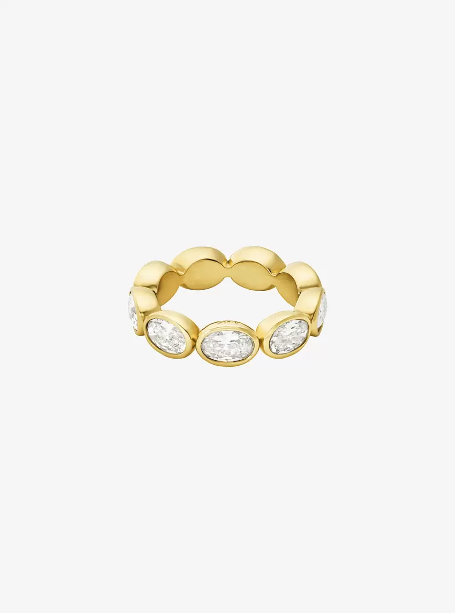 Niezależnie od tego, czy nosisz ją samodzielnie, czy jako część zestawu, ten pierścionek tenisowy z pewnością zrobi wrażenie. Obrączka eternity prezentuje błyszczące owalne kamienie oprawione w mosiądz pozłacany 14-karatowym złotem, co nadaje jej przyciągający wzrok, a zarazem ponadczasowy wygląd.