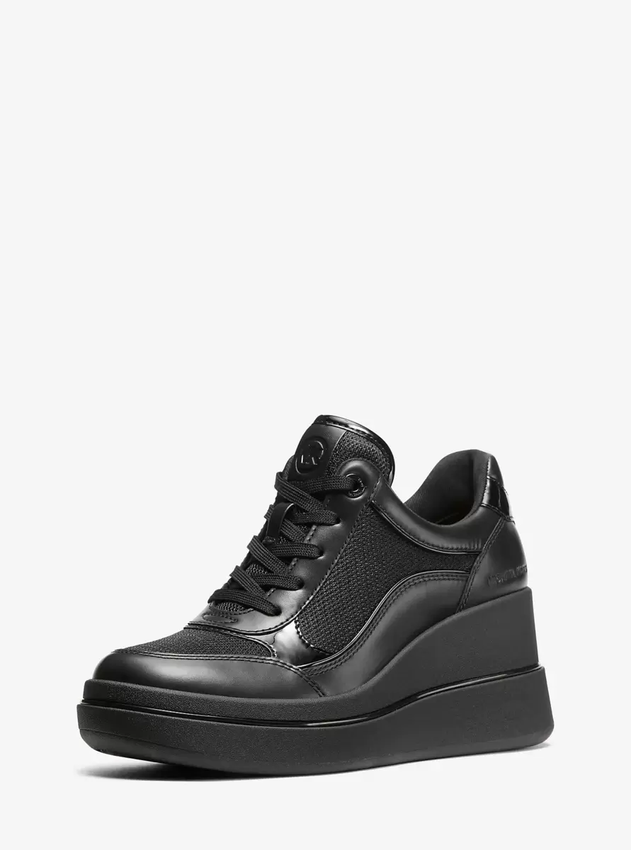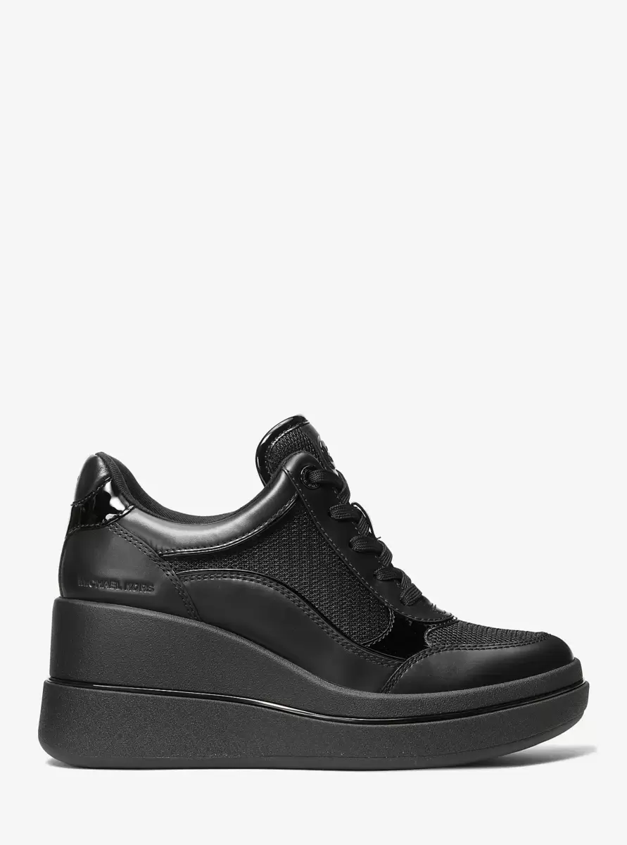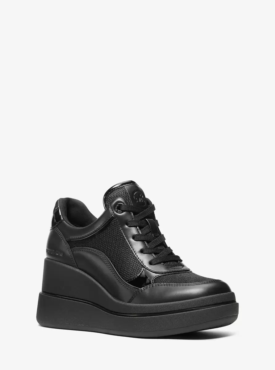 Podnieś swój codzienny styl dzięki tenisówkom na koturnie Emmy. Wykonane z gładkiej i lakierowanej skóry z przewiewnymi siateczkowymi panelami, te nowoczesne buty mają sznurowane zapięcie i platformę. Monochromatyczna, czarna kolorystyka zapewnia wszechstronność, dzięki czemu idealnie pasują do krótkich jeansów lub ulubionej sukienki midi, tworząc niezobowiązująco szykowny look.