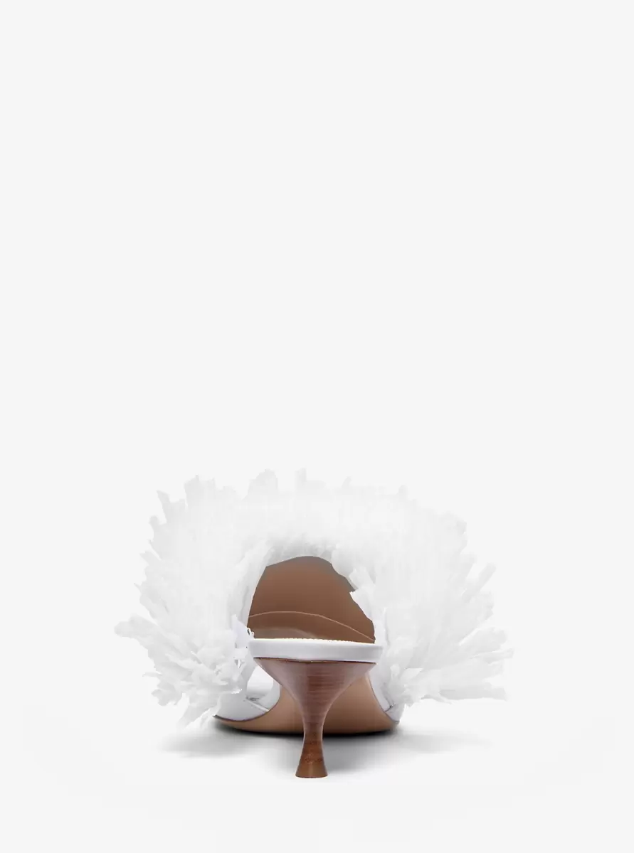 Efektowna falbana z teksturowanych frędzli sprawia, że muły Catarina przechodzą z stonowanych w wyraziste. Wykonane we Włoszech z gładkiej skóry cielęcej i osadzone na obcasie typu „kaczuszek”, te buty to absolutny must-have na Twój kolejny wypad w ciepłe dni.