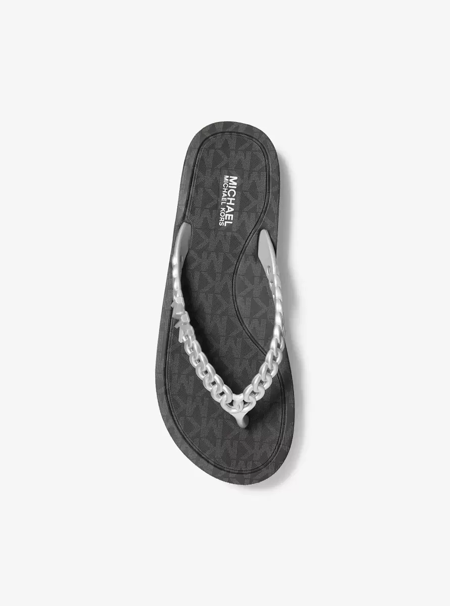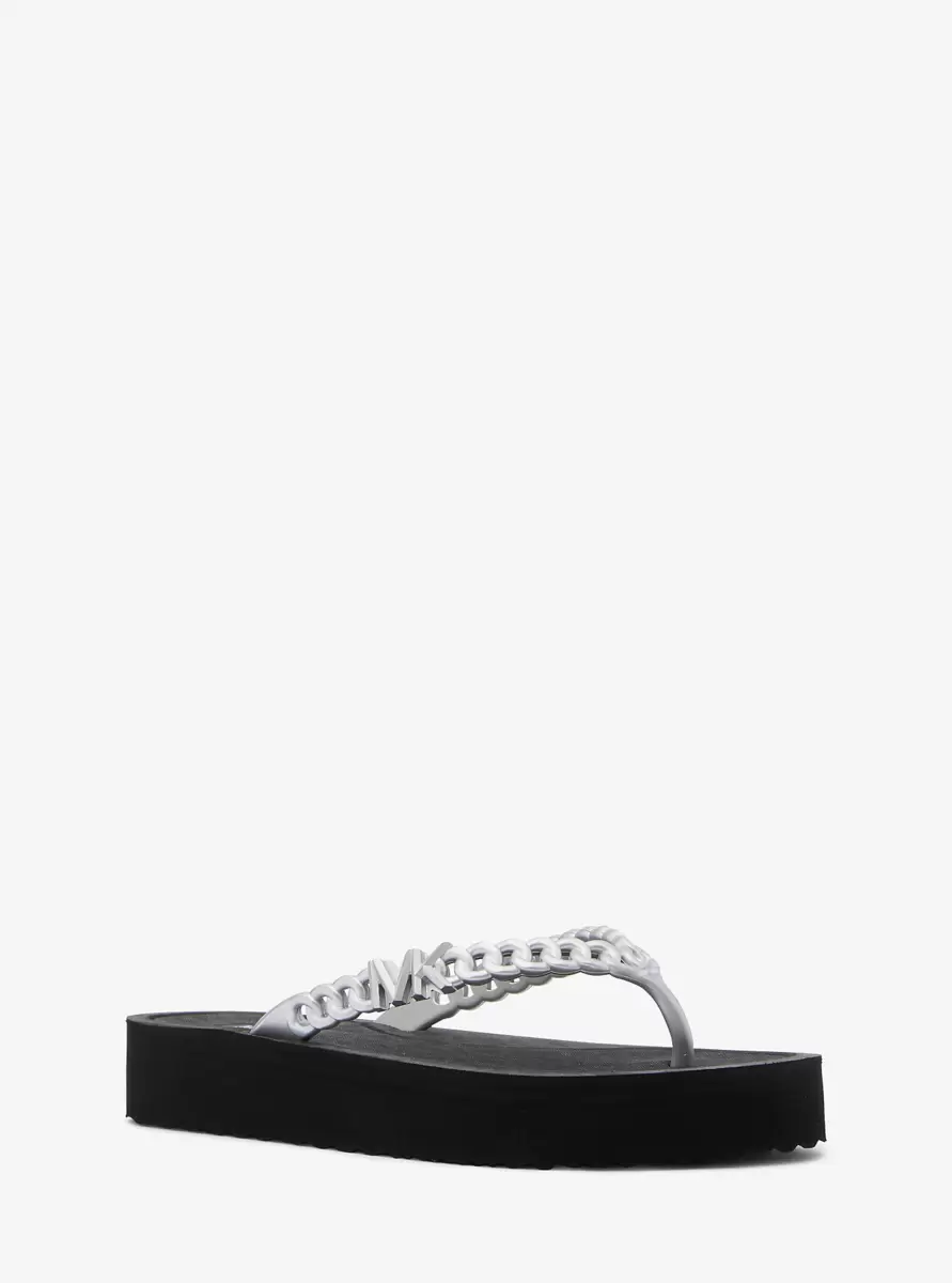 Od plaży po promenadę, nasze japonki Zaza urozmaicą każdą swobodną stylizację na ciepłe dni. Posiadają paski inspirowane ogniwami łańcuszka z graficznym logo, a całość uzupełnia wygodna podeszwa na platformie.