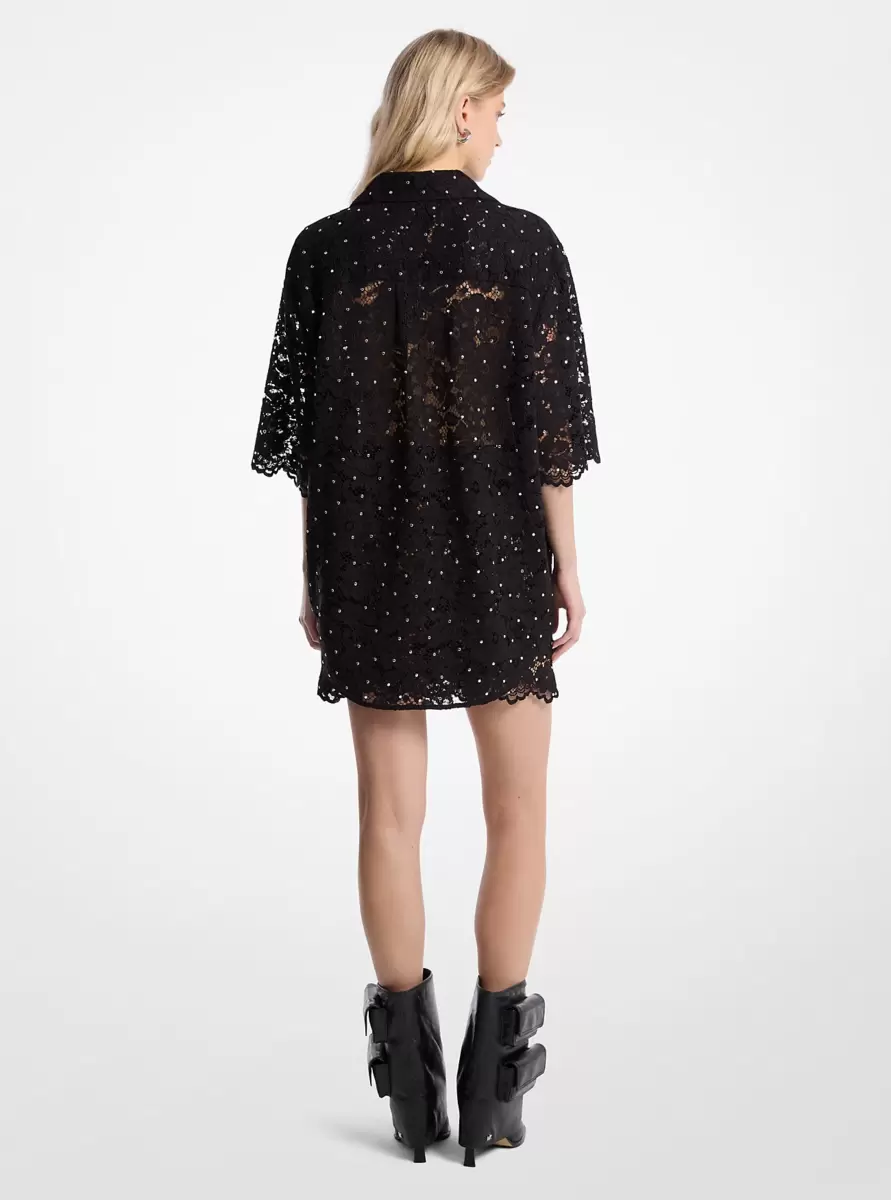 Błyszczące ćwieki dodają charakteru tej inspirowanej stylem vintage sylwetce na wiosnę. Ta koszula w stylu boho o lekko luźnym kroju jest wykonana z koronki w kwiaty, nadając jej romantycznego charakteru. Połącz ją z pasującą mini spódniczką, tworząc idealny zestaw na dzień i na wieczór.