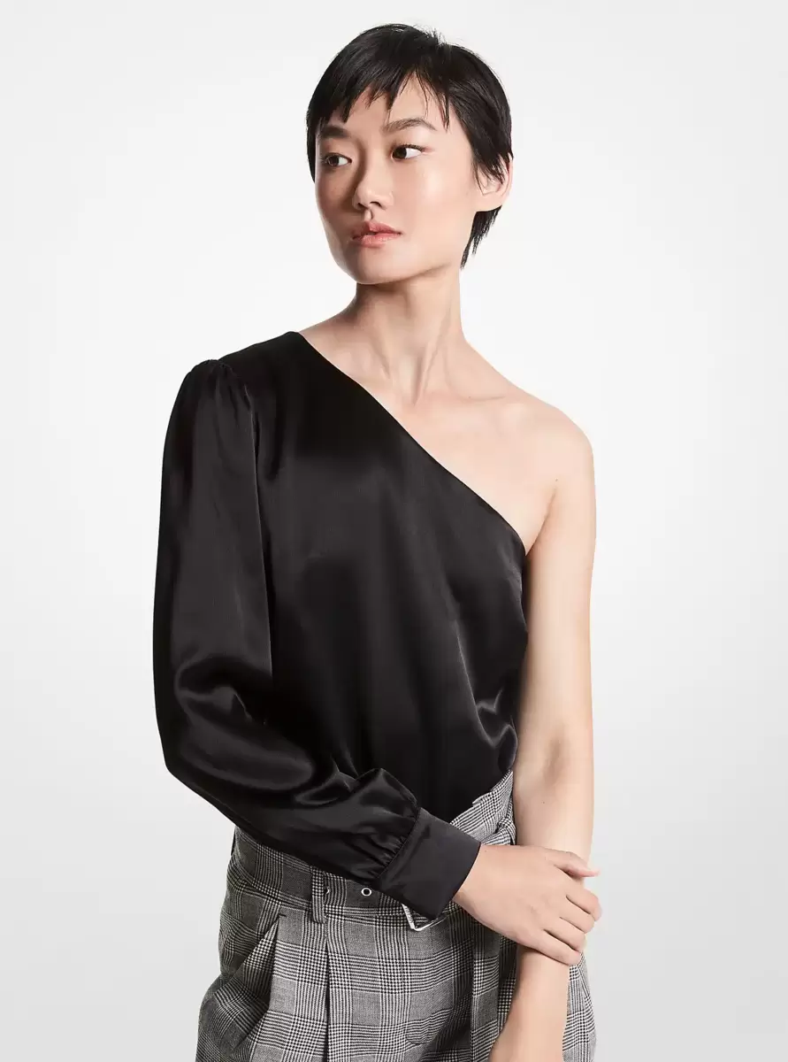 Kultowa sylwetka lat 90. powraca w wielkim stylu. Wykonana z lśniącej satyny, ta przyciągająca wzrok bluzka ma kuszący fason na jedno ramię. Uwielbiamy, jak elegancko prezentuje się zarówno ze spodniami w kratę, jak i spódniczką.