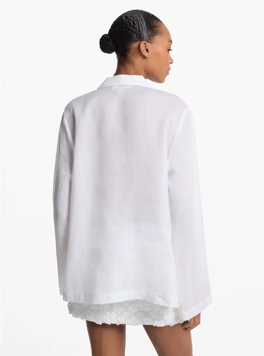 Ta ponadczasowa tunika jest jednocześnie lekka i elegancka, o prostych liniach, uszyta z miękkiej ramii. Jej lśniący kołnierzyk w szpic równoważy swobodny wiązanie przy szyi, a rękawy dzwony dodają objętości. Połącz ją z szortami, mini spódniczką lub lnianymi spodniami – pasuje do wszystkiego.