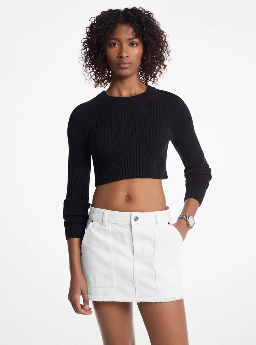 Ta spódnica z jeansu zasługuje na miejsce w każdej szafie. Postrzępiona, aby wyglądała na mocno zużytą, jest uszyta z grubej bawełny w wyrazistym, białym odcieniu, który pasuje niemal do wszystkiego.