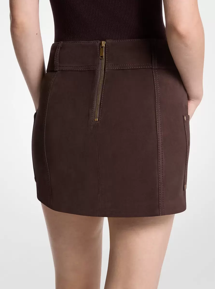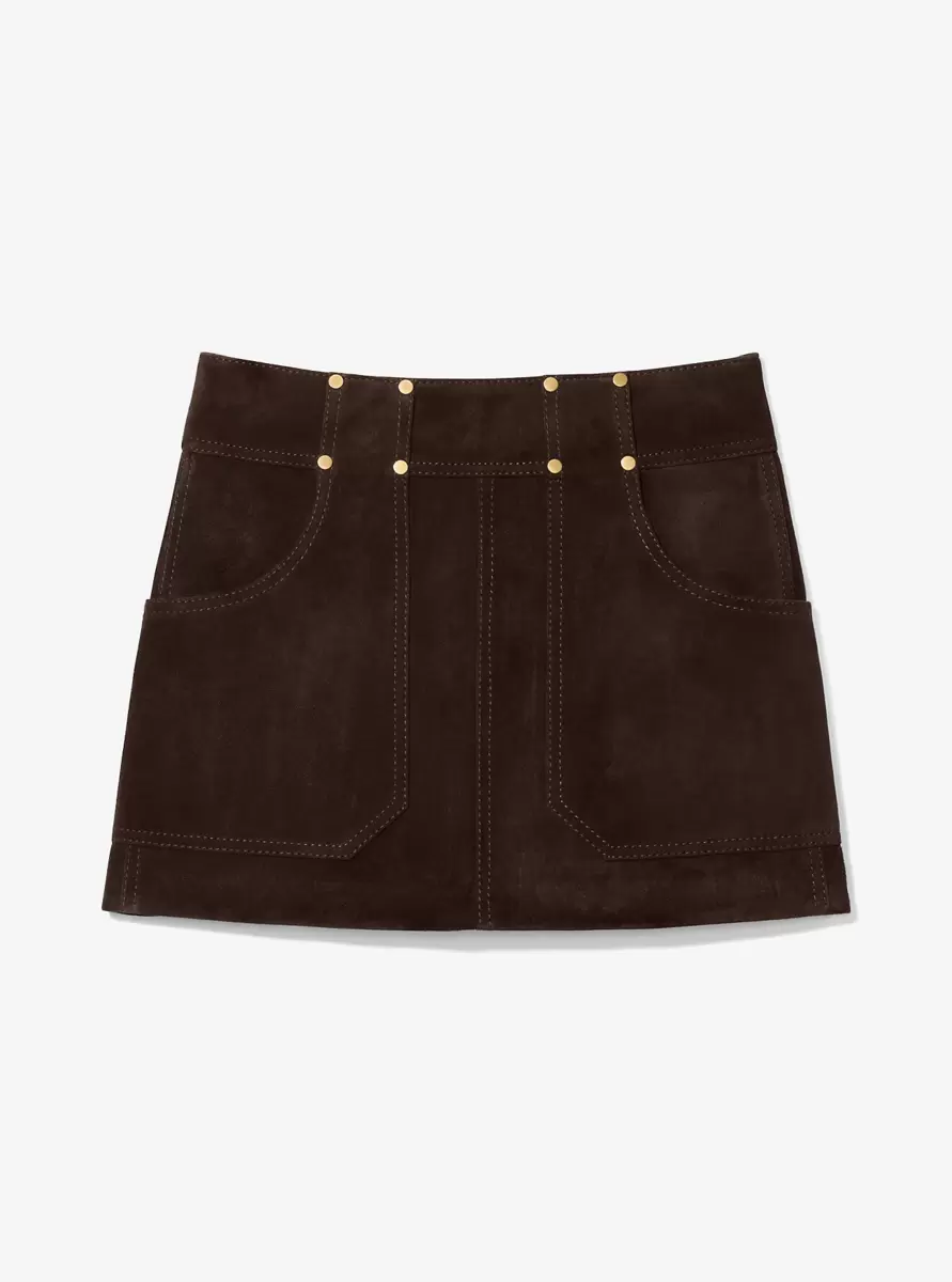 Wykonana z luksusowego zamszu, ta przyciągająca wzrok mini spódniczka ma złote ćwieki wzdłuż pasa i funkcjonalne kieszenie z przodu, które są zarówno stylowe, jak i praktyczne. Uzupełnij stylizację pasującą kurtką z frędzlami, aby uzyskać spójny zestaw inspirowany stylem western.