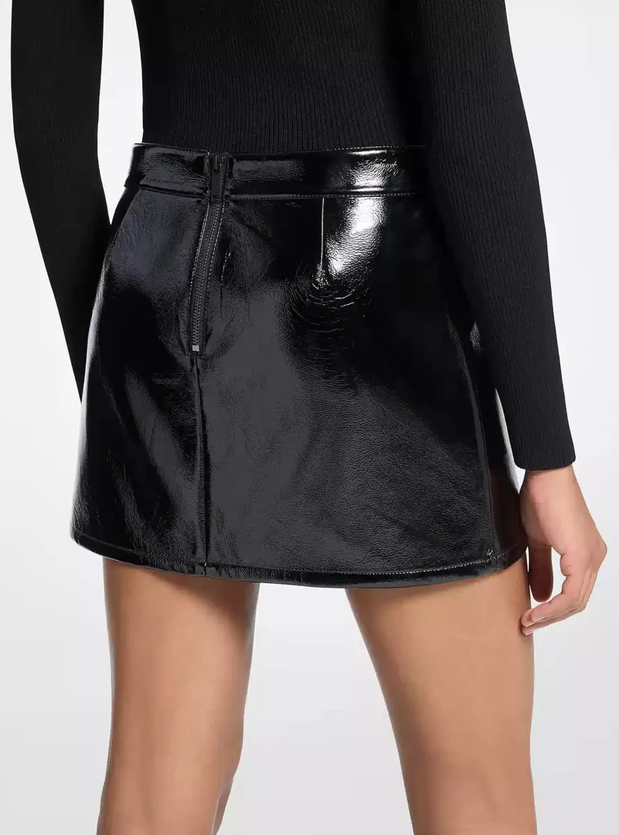 Poczuj klimat retro z tą mini spódniczką, zaprojektowaną z błyszczącego lakierowanego materiału i o długości mikro mini. Ma atrakcyjny krój w kształcie litery A i wysoki stan, optycznie wydłużając nogi. Noś ją z eleganckim golfem i kozakami do kolan, aby uzyskać szykowny, przyciągający wzrok look.