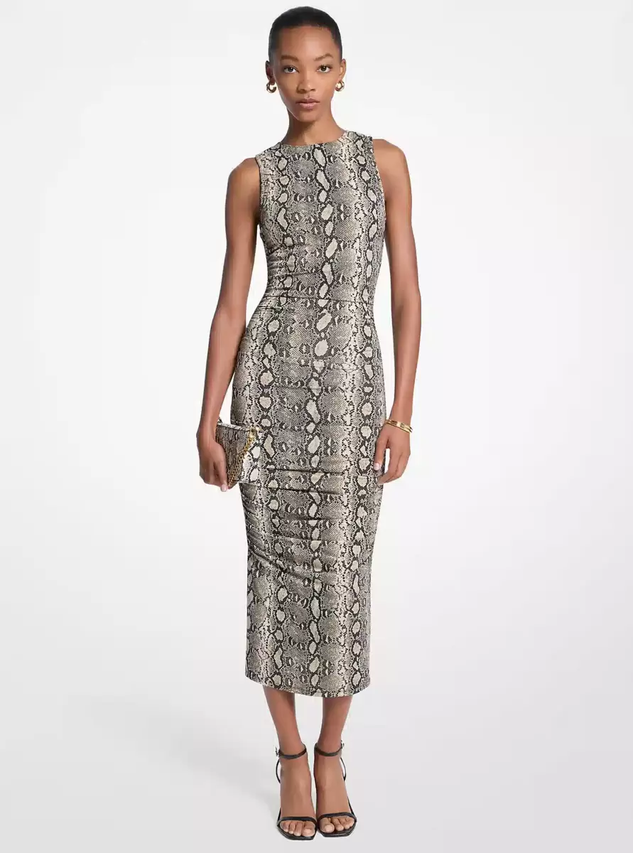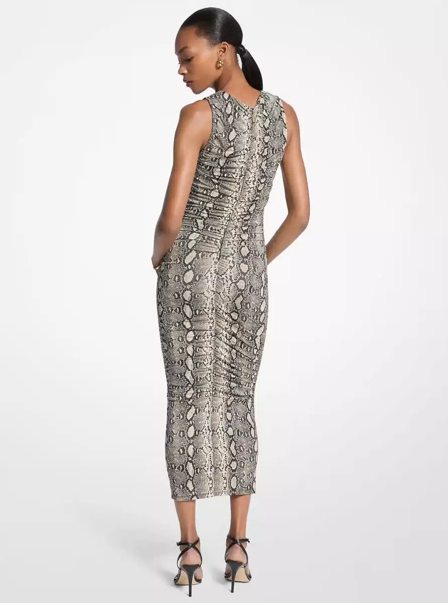 Sukienka midi z elastycznej dzianiny z nadrukiem węża i marszczeniami
