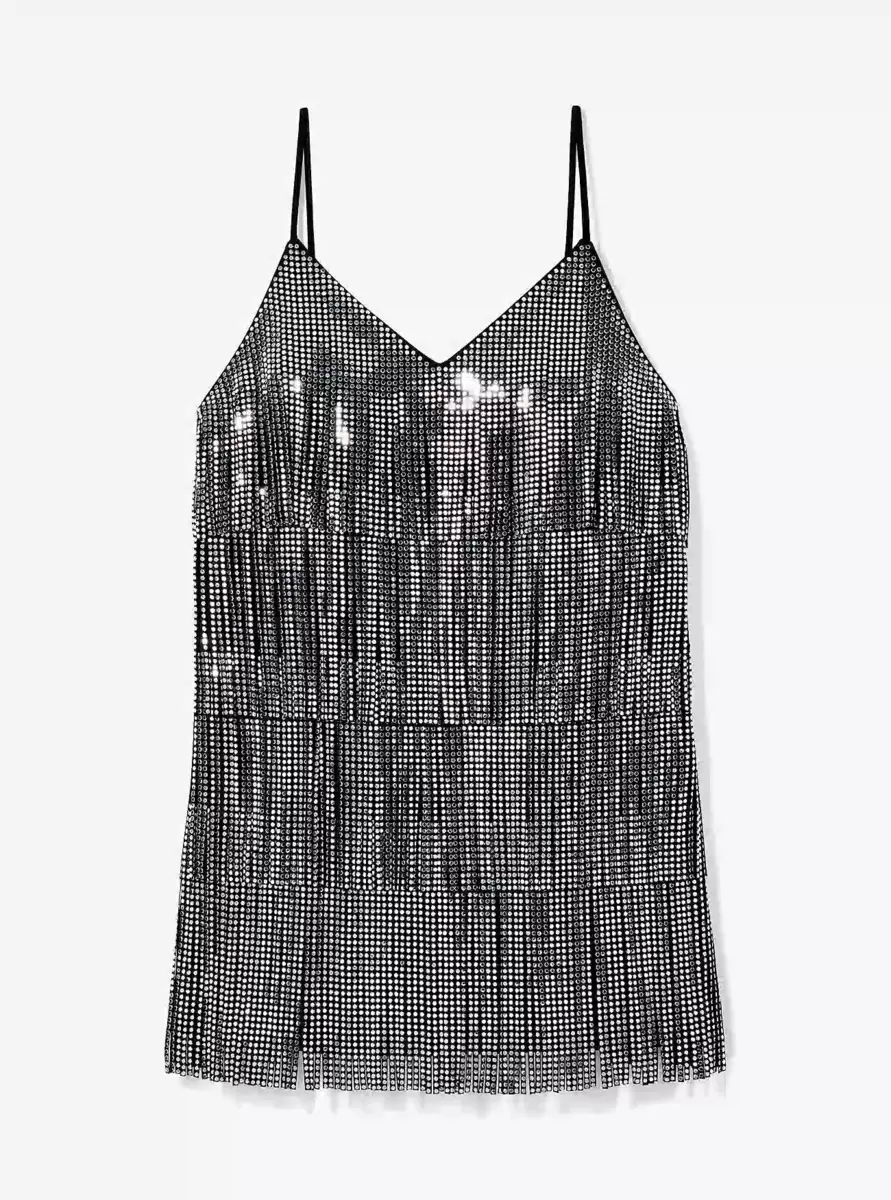 Rozświetl każdy pokój w tej przyciągającej wzrok sukience typu slip. Wyróżniają ją warstwowe rzędy frędzli nabijanych ćwiekami, które dodają jej lekkości i blasku z każdym krokiem. Zadbaj o jej wyjątkowy charakter, wybierając minimalistyczne dodatki podczas kolejnego wieczornego wyjścia lub na kolejne wakacyjne przyjęcie.