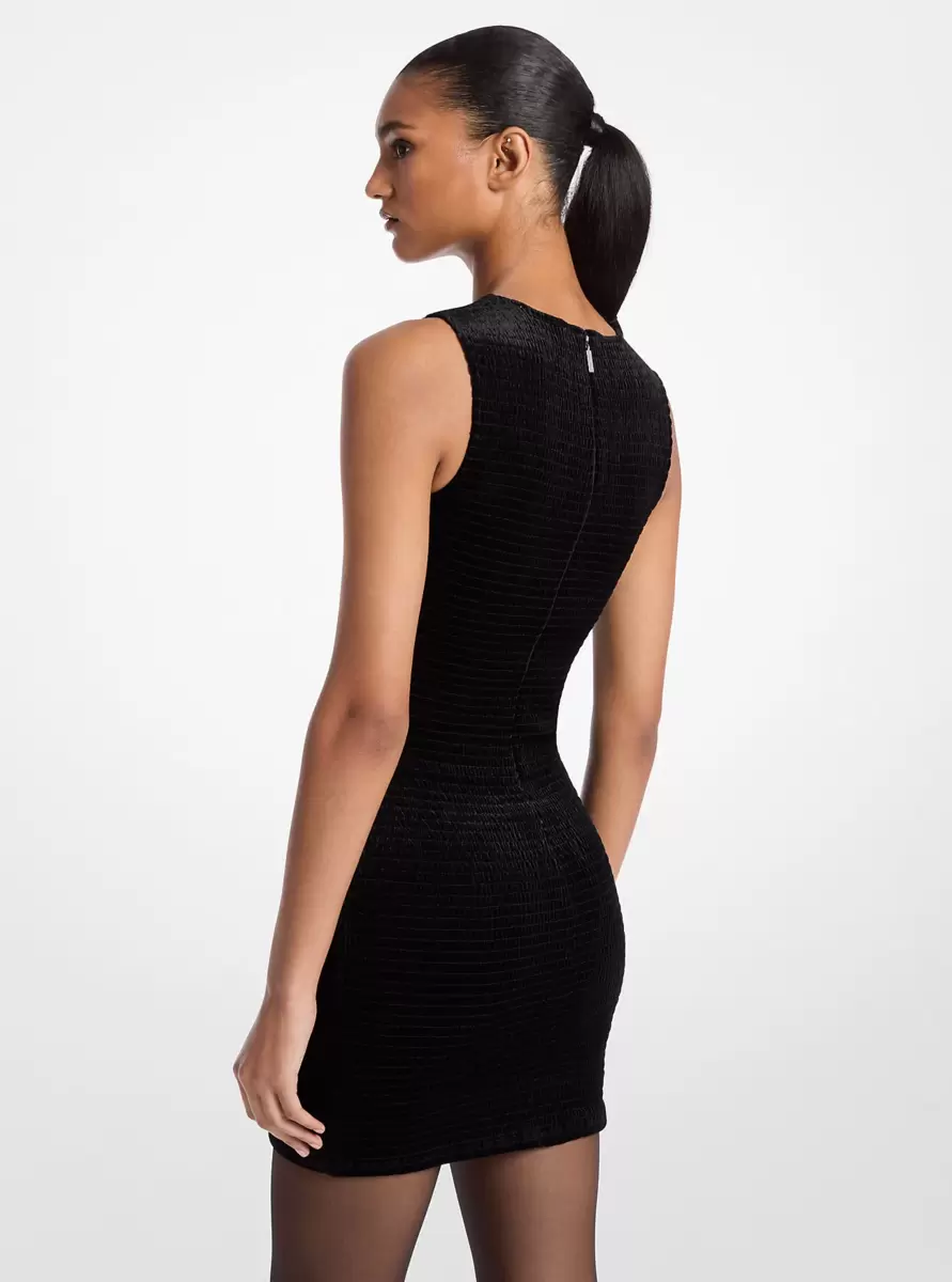 Wykonana z lśniącego aksamitu, ta szykowna, mała sukienka ma marszczenia na całej powierzchni, które dodają jej podwójnej dawki tekstury. Minimalistyczny fason z podkreślającym figurę stretchem stanie się Twoją nową ulubioną małą czarną. Wystarczy dodać błyszczącą biżuterię na świąteczne okazje.
