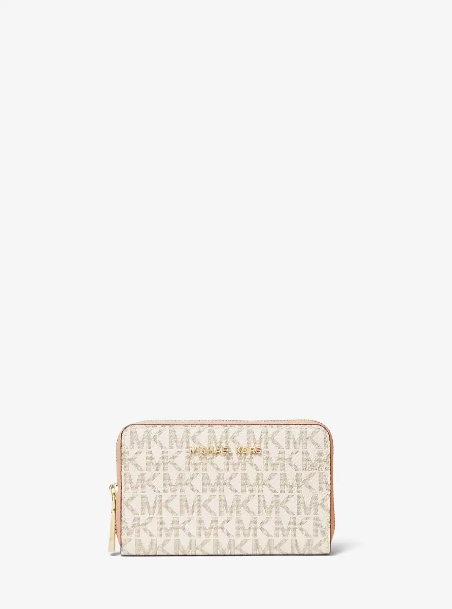 Ten kompaktowy portfel z twillu z nadrukiem logo otwiera się, odsłaniając liczne przegródki na karty i miejsce na gotówkę. Uwielbiamy to, że zewnętrzna kieszeń wsuwana zapewnia szybki dostęp do dowodu osobistego. Wsuń go do pasującej torby lub noś jako kopertówkę wieczorem.