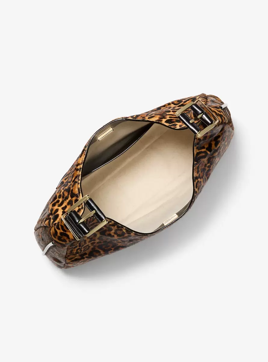 Torba typu hobo Nolita prezentuje się swobodnie, a jednocześnie elegancko, dzięki efektownej sierści cielęcej w panterkę z usztywnionymi krawędziami, które podkreślają jej kształt. Posiada regulowany skórzany pasek na ramię z polerowanymi klamrami i duże, otwarte wnętrze, w którym zmieścisz wszystko, czego potrzebujesz.