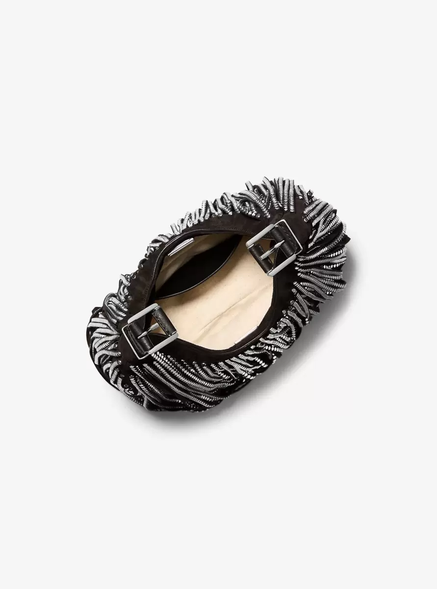 Ta przyciągająca wzrok torba hobo Nolita, ozdobiona efektownymi frędzlami nabijanymi ćwiekami, doda Twojemu codziennemu stylowi przepychu i nuty westernowego uroku. Kompaktowa sylwetka wyposażona jest w gładki, skórzany pasek na ramię z polerowanymi klamrami, umożliwiającymi regulację dopasowania. Wewnątrz znajdziesz wsuwaną kieszeń z napisem z limitowanej edycji. Uważamy, że to idealne, przyciągające wzrok wykończenie Twojego wieczorowego stroju.