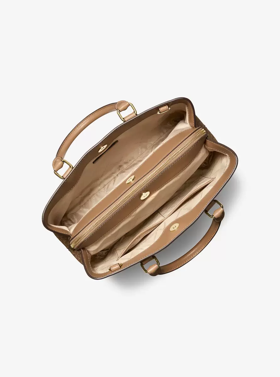 Nasz nadruk z logo Signature i wyprofilowany kształt łączą się, tworząc ponadczasową i wyrafinowaną torbę Camille. Środkowa przegroda zapinana na zamek pozwala na uporządkowanie dokumentów i codziennych drobiazgów, a regulowany pasek na ramię pozwala mieć wolne ręce. Uważamy, że to idealna torba na zabiegane dni w podróży.