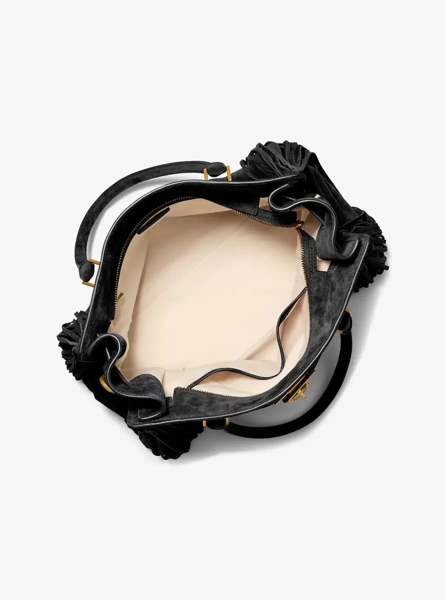 „Zawsze uważam, że idealna klasyka nigdy nie wychodzi z mody. Ponowne wprowadzenie naszej torby Hamilton dowodzi, że dobry design jest ponadczasowy” – mówi Michael Kors. Nasza torba Hamilton Moderne nawiązuje do inspirowanych stylem vintage toreb podróżnych, ale ma nowoczesny, odświeżony charakter. Luksusowy zamsz uzupełniają okucia w kolorze starego złota, a frędzle dodają boho charakteru każdemu krokowi. Pojemne wnętrze z łatwością pomieści codzienne drobiazgi, takie jak tablet, notes, portfel i wiele innych.