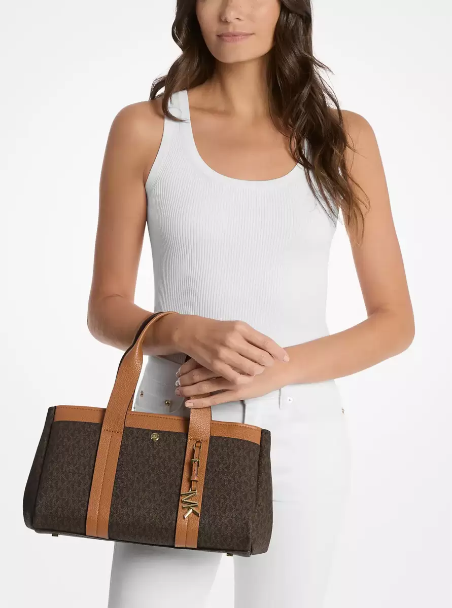Współczesny glamour w centrum uwagi dzięki naszej torbie Romee. Wykonana jest z płótna z nadrukiem Signature, ze skórzanymi wykończeniami i ozdobiona polerowanym logo MK. Wytrzymałe uchwyty u góry są dopasowane do wygodnego noszenia na ramieniu, a pasek na ramię zapewnia stylowe noszenie bez użycia rąk.