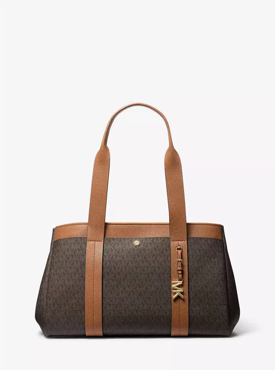 Nasza torba Romee to idealny towarzysz na co dzień dzięki pojemnemu wnętrzu i ponadczasowemu wzornictwu. Metalowe logo nadaje tej płóciennej wersji z nadrukiem Signature odrobinę blasku, a wytrzymałe skórzane paski pozwalają wygodnie nosić ją na ramieniu. Uważamy, że to idealna torba zarówno na codzienne zakupy, jak i na weekendowe podróże.