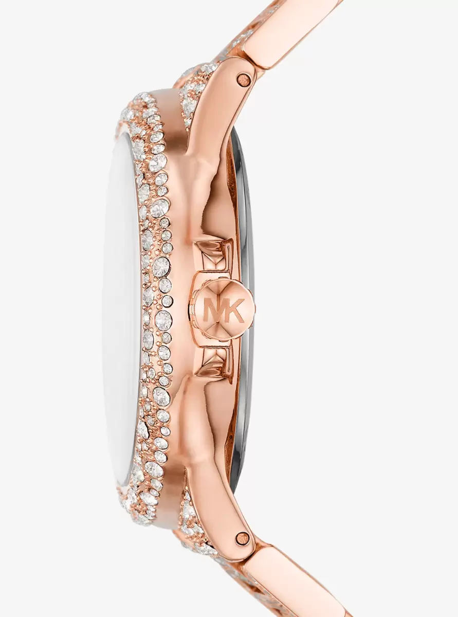 Nasz duży zegarek Camille stanowi idealną równowagę między wyrazistością a elegancją. Ten nowoczesny zegarek w kolorze różowego złota, ozdobiony całopowierzchniowymi akcentami w kształcie płaszczki, zachwyca eleganckimi stoperami i zdobionymi w kamieniu subtarczami, które dodają mu blasku. Noś go ze wszystkim, od swobodnych, swobodnych zestawów po zestawy do pracy.