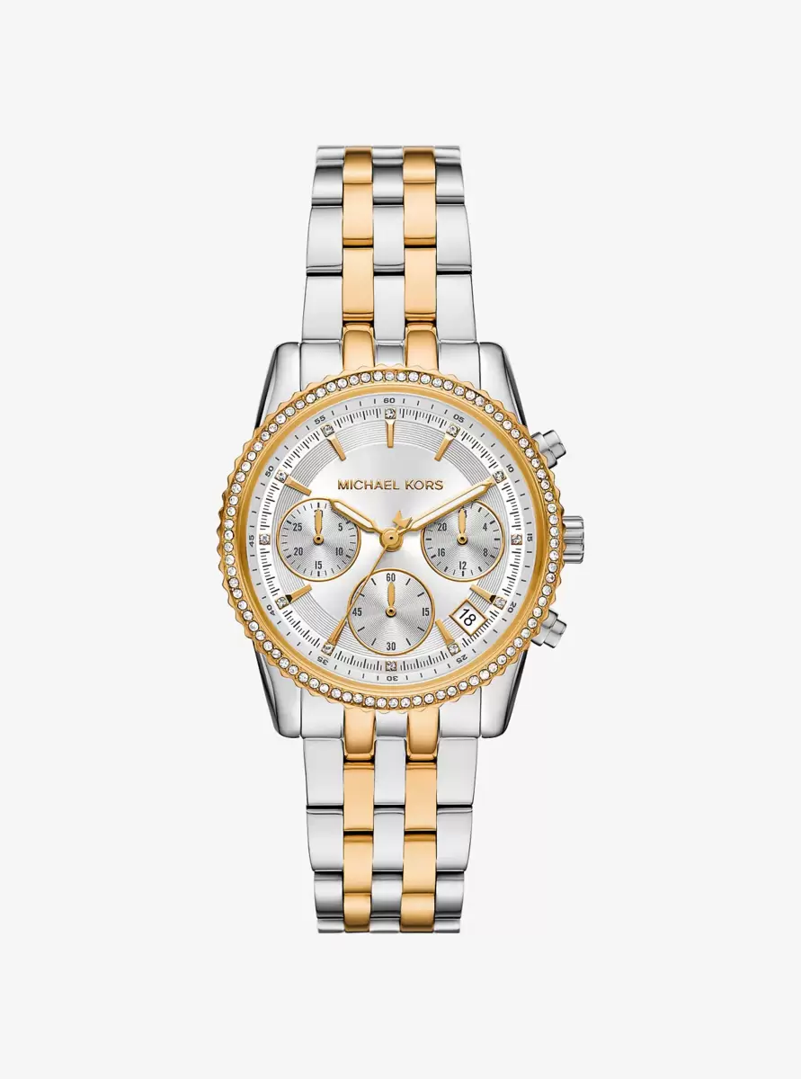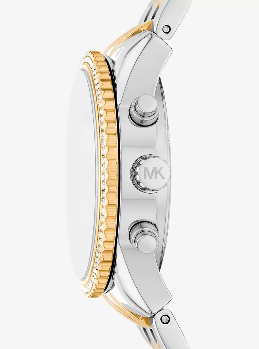 Lśniący i wyrafinowany zegarek Bryant łączy w sobie stal szlachetną w odcieniach złota i srebra z inspirowanym męską odzieżą paskiem bransoletowym, tworząc szykowne i ponadczasowe wykończenie. Wyświetlacz chronografu zapewnia funkcjonalność, a zdobienia pavé wzdłuż ramki dodają blasku.
