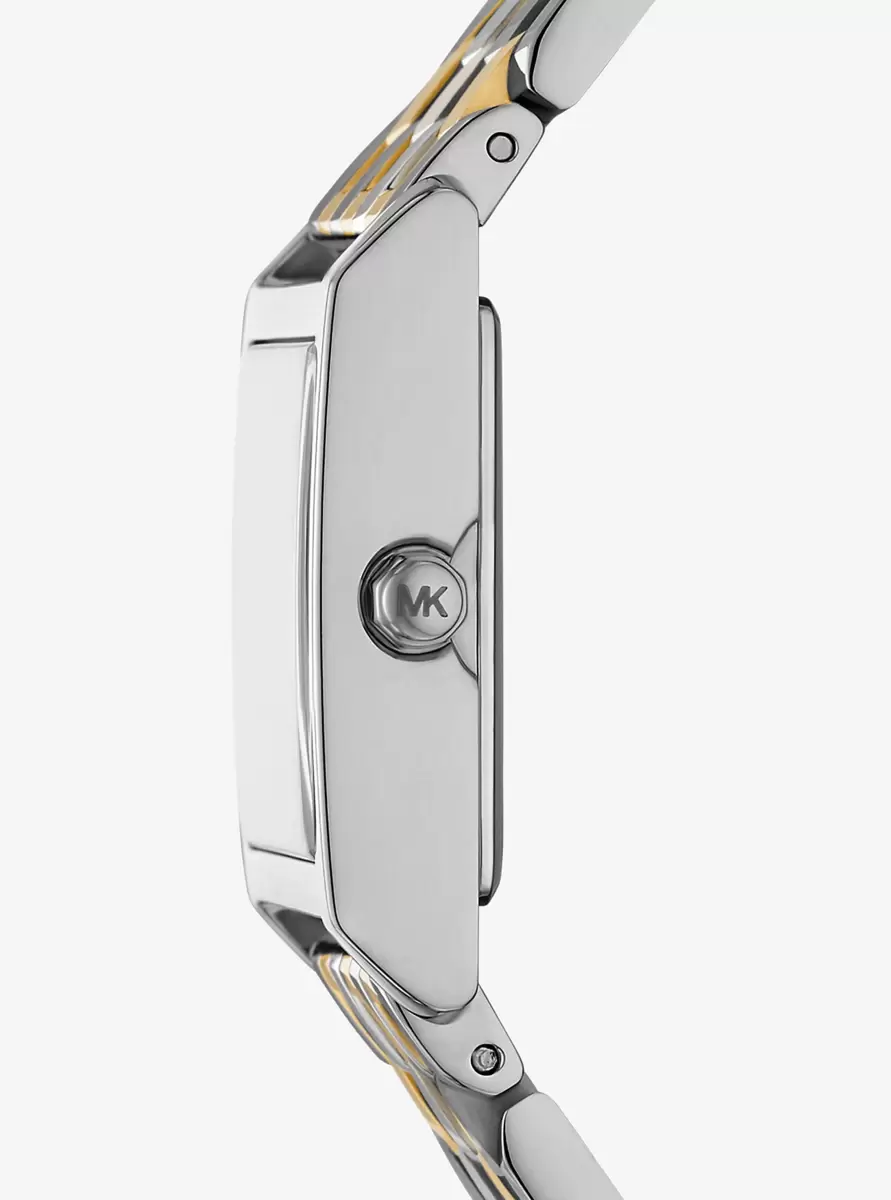 Mały zegarek Georgie charakteryzuje się wyrafinowaną, kwadratową sylwetką i efektownym, dwukolorowym designem. Wykonany ze stali nierdzewnej z naprzemiennymi wykończeniami w odcieniach srebra i złota, ten elegancki zegarek oferuje dyskretny luksus, idealny zarówno na co dzień, jak i na specjalne okazje.