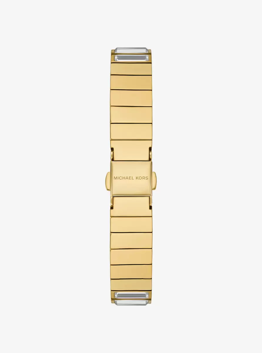 Nasz delikatny zegarek Darrington powraca latem 2025 roku w nowej, dekadenckiej odsłonie. Zdefiniowana miniaturową tarczą w kolorze złota, ta limitowana edycja została wzbogacona o pasek z cyrkonii sześciennych z bezelem, tworząc elegancką sylwetkę inspirowaną bransoletą tenisową. Elegancka koperta ze stali nierdzewnej obraca się, odsłaniając grawerowany podpis Michaela Korsa na deklu oraz unikalny numer identyfikacyjny. Niezależnie od tego, czy nosisz go w zestawie, czy osobno, pokochasz to, jak elastyczna konstrukcja ogniwa zapewnia wygodę noszenia na co dzień.