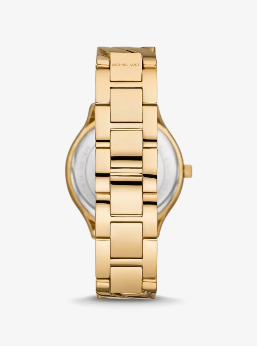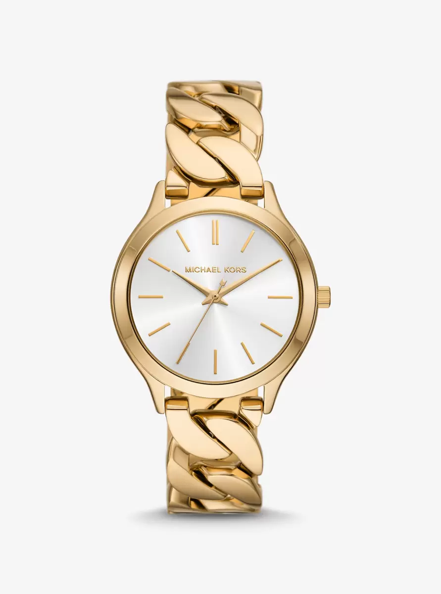 Nasz pożądany zegarek Slim Runway został odświeżony z myślą o nowoczesnym glamour. Zaprojektowany z elegancką, minimalistyczną tarczą, posiada bransoletę typu curb-link, która stanowi luksusową alternatywę dla tradycyjnych ogniw centralnych. Dopełnij go pasującą biżuterią w kolorze złotym, aby stworzyć wyjątkową okazję.