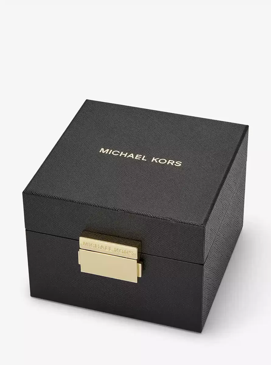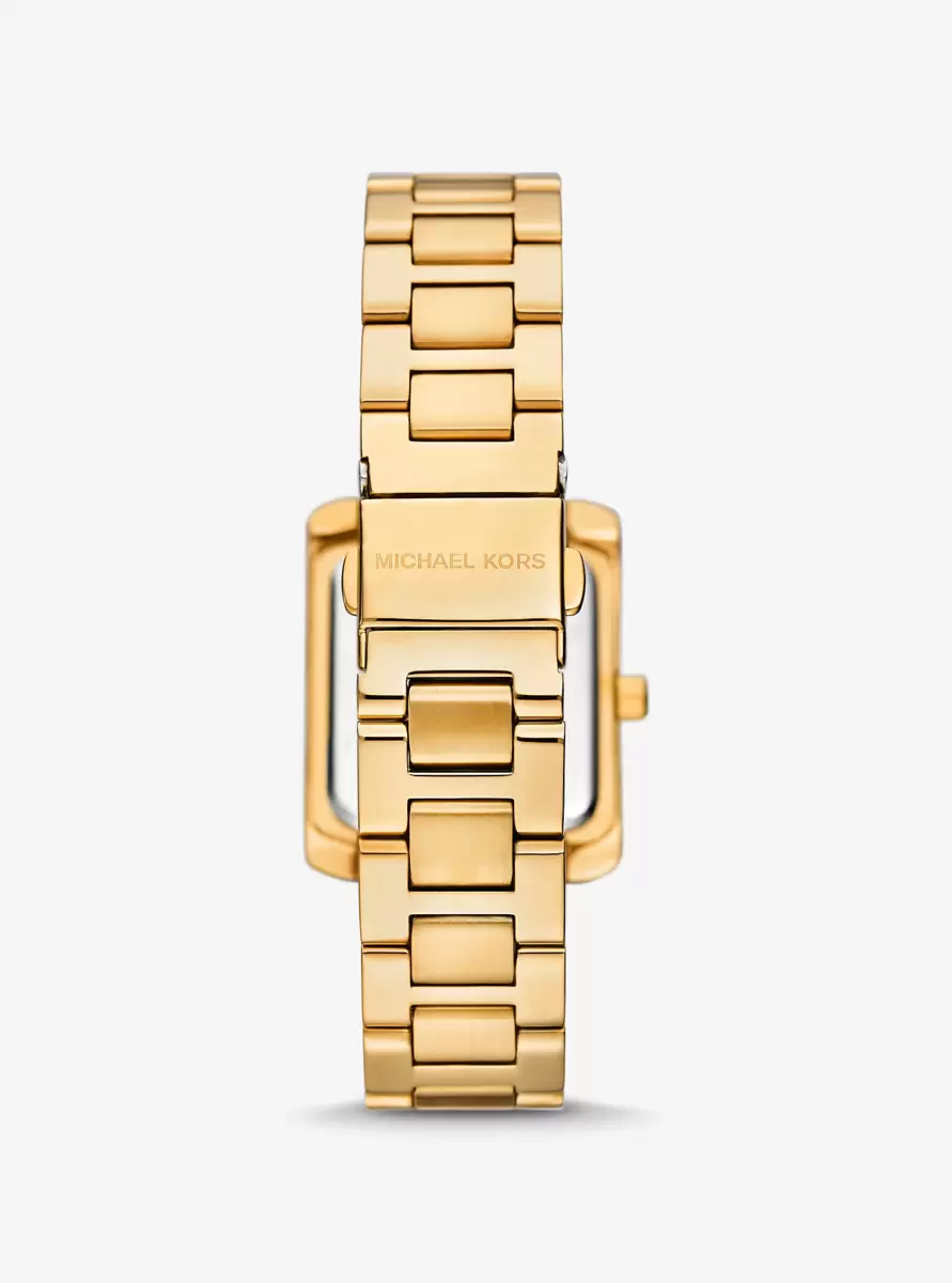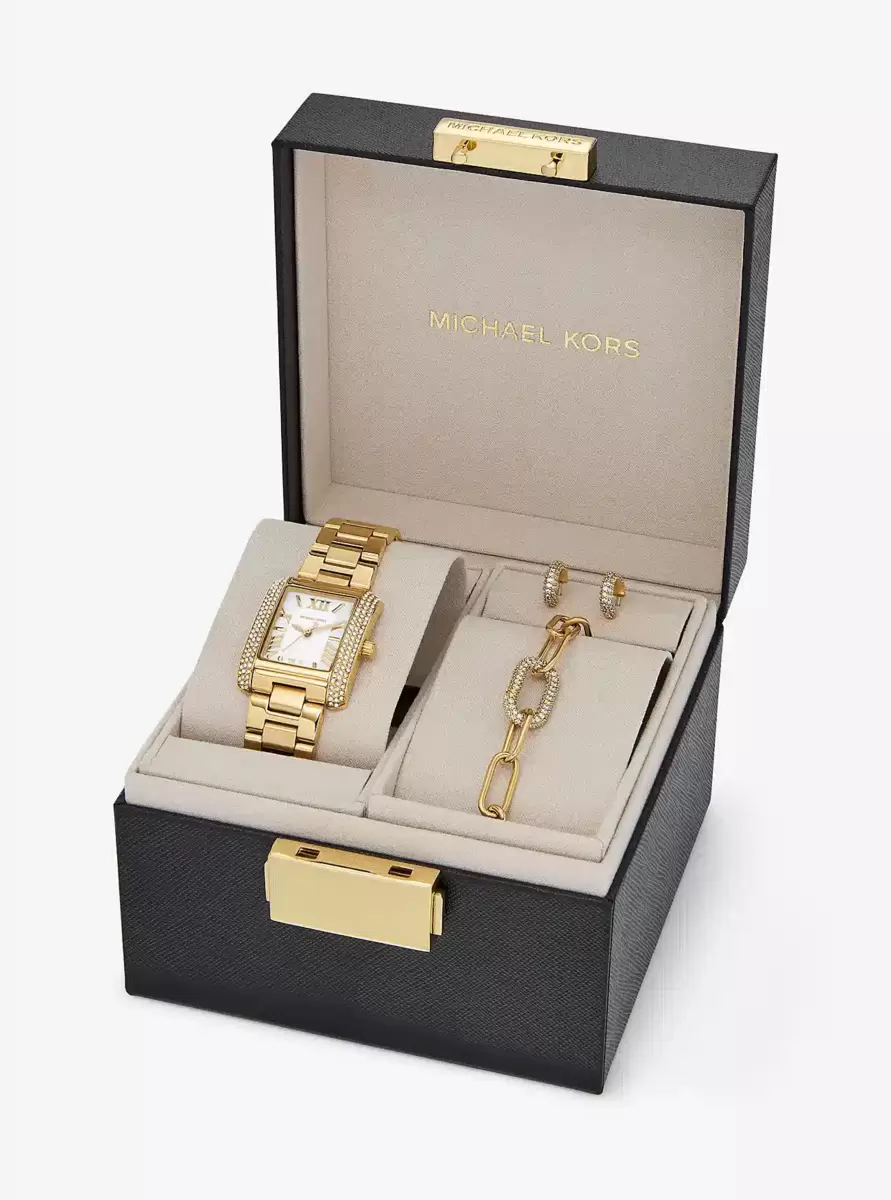 Ten trzyczęściowy zestaw wysadzany kamieniami pavé zawiera nasz mały zegarek Emery jako centralny element, bransoletę z ogniwami łańcuszka i kolczyki koła. Złoty zegarek ma prostokątną tarczę, fazowany pasek i rzymskie indeksy dla klasycznego wykończenia. Noszone razem, te elementy są po prostu olśniewające.