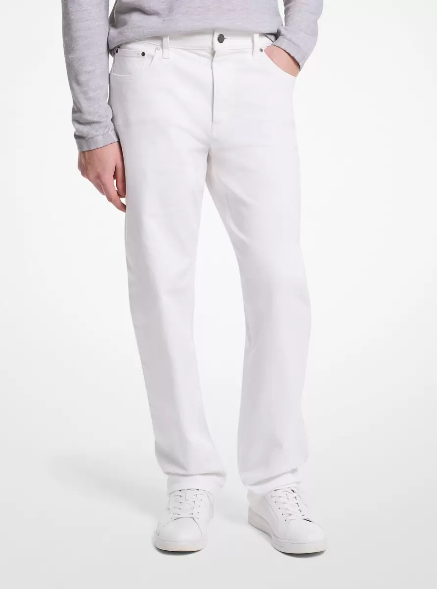 Te proste jeansy są wykonane z elastycznego denimu bawełnianego w białym odcieniu, który nadaje im ponadczasowy charakter, i subtelnie wykończone srebrnymi, wygrawerowanymi logo na kieszeniach. Sięgnij po nie, aby dopasować je do wszystkiego, od koszul z kołnierzykiem po T-shirty.