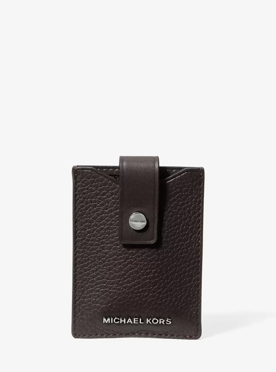 Nawiąż stylowe kontakty z wizytownikiem Hudson. Wykonany z miękkiej, groszkowanej skóry z zapięciem na zatrzask, wizytówki pozostają zawsze w zasięgu ręki.
