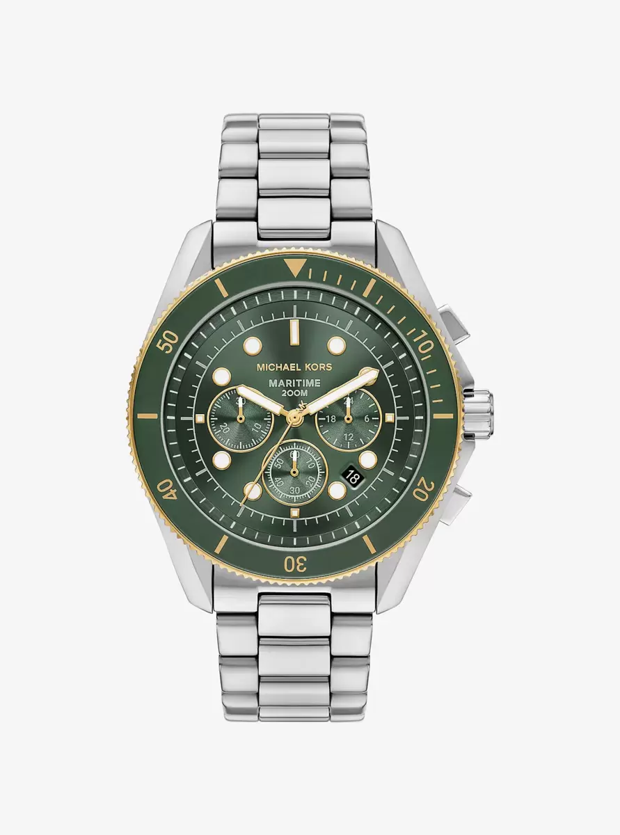 Zanurz się w kolejną przygodę z naszym zegarkiem Maritime ze stali nierdzewnej. Zaprojektowany, aby być wytrzymałym i odpornym na większość warunków podwodnych, ten elegancki dwukolorowy zegarek z pewnością zabierze Cię na głębokość do 200 metrów dzięki zakręcanej koronce. Tarcza w odcieniu oliwkowym zdobi klasyczna tarcza z trzema wskazówkami i technologia Super Lume, która pozwala użytkownikowi śledzić czas w warunkach słabego oświetlenia.