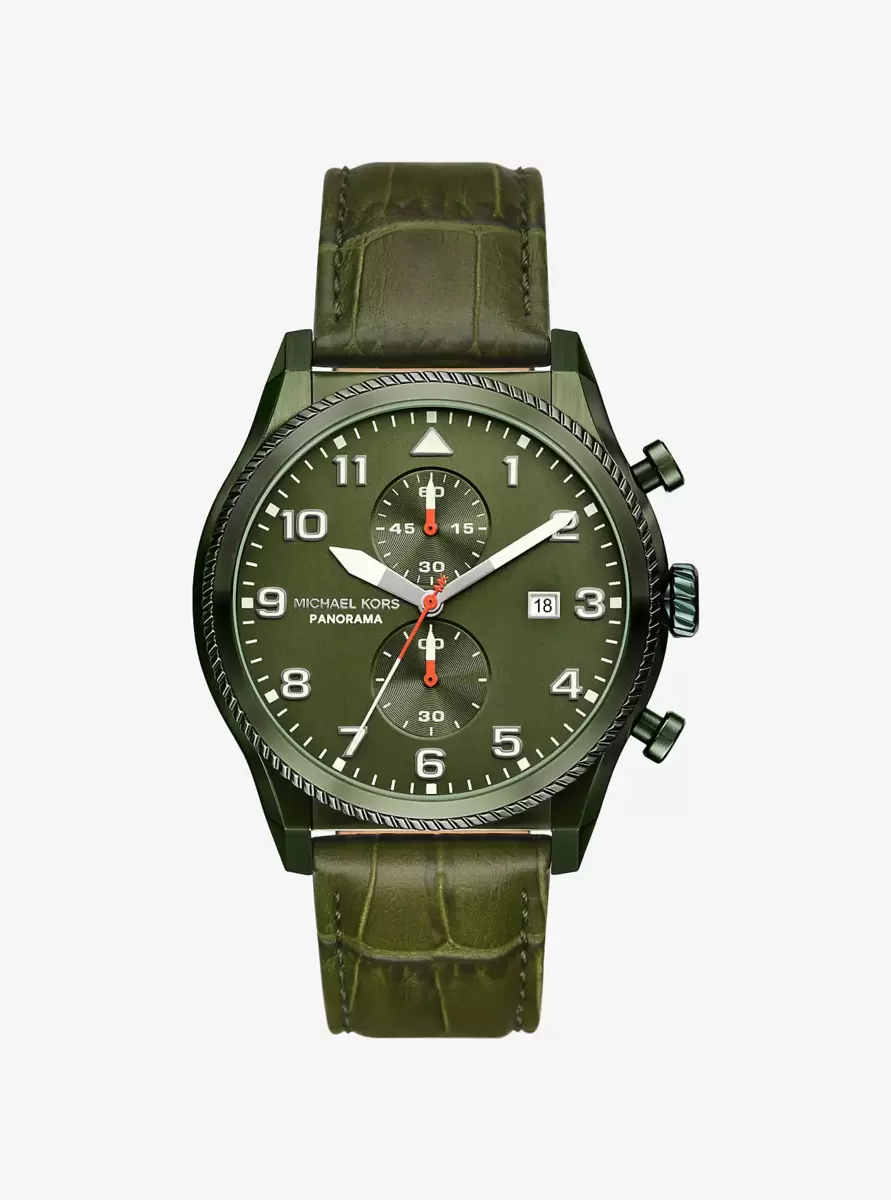 Nasz zegarek Panorama to wyrafinowany dodatek na lata, wyposażony w skórzany pasek i pierścień z tłoczeniem skóry krokodyla, podkreślone pasującą oliwkową tarczą z tarczami chronografu. Możesz liczyć na niego, jeśli szukasz wyrafinowanego, sportowego wyglądu na każdy dzień tygodnia.