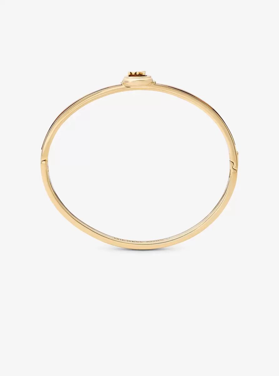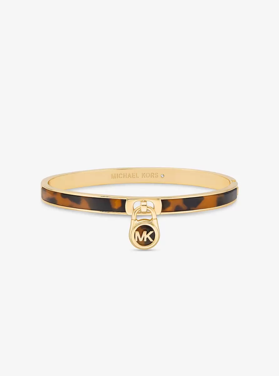 Ta złota bransoletka typu bangle ozdobiona jest zawieszką inspirowaną elementami z naszej ukochanej torebki Hamilton i wykończona jest akcentami z octanu w kolorze skorupy żółwia. Zapięcie na zatrzaski ułatwia zakładanie i zdejmowanie.