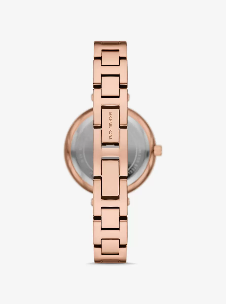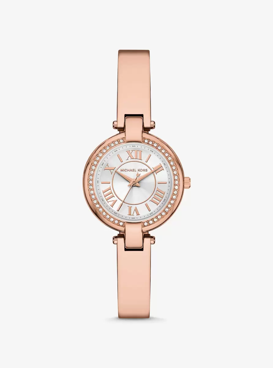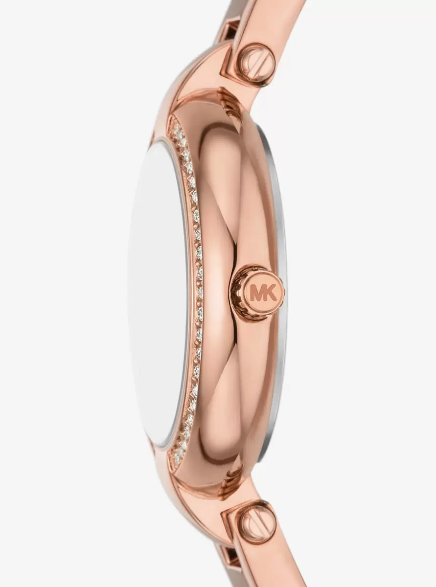 Miniaturowy zegarek Laney to majstersztyk w subtelnej elegancji. Odświeżony designem inspirowanym bransoletą, charakteryzuje się okrągłym bezelem wysadzanym kamieniami pavé i tarczą z masy perłowej z klasycznymi rzymskimi cyframi. Wykonany ze stali nierdzewnej w kolorze różowego złota, został zaprojektowany z myślą o noszeniu przez lata.