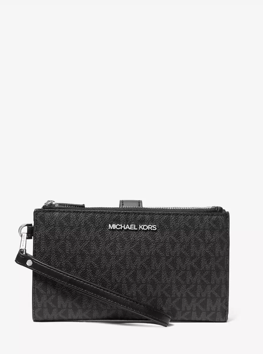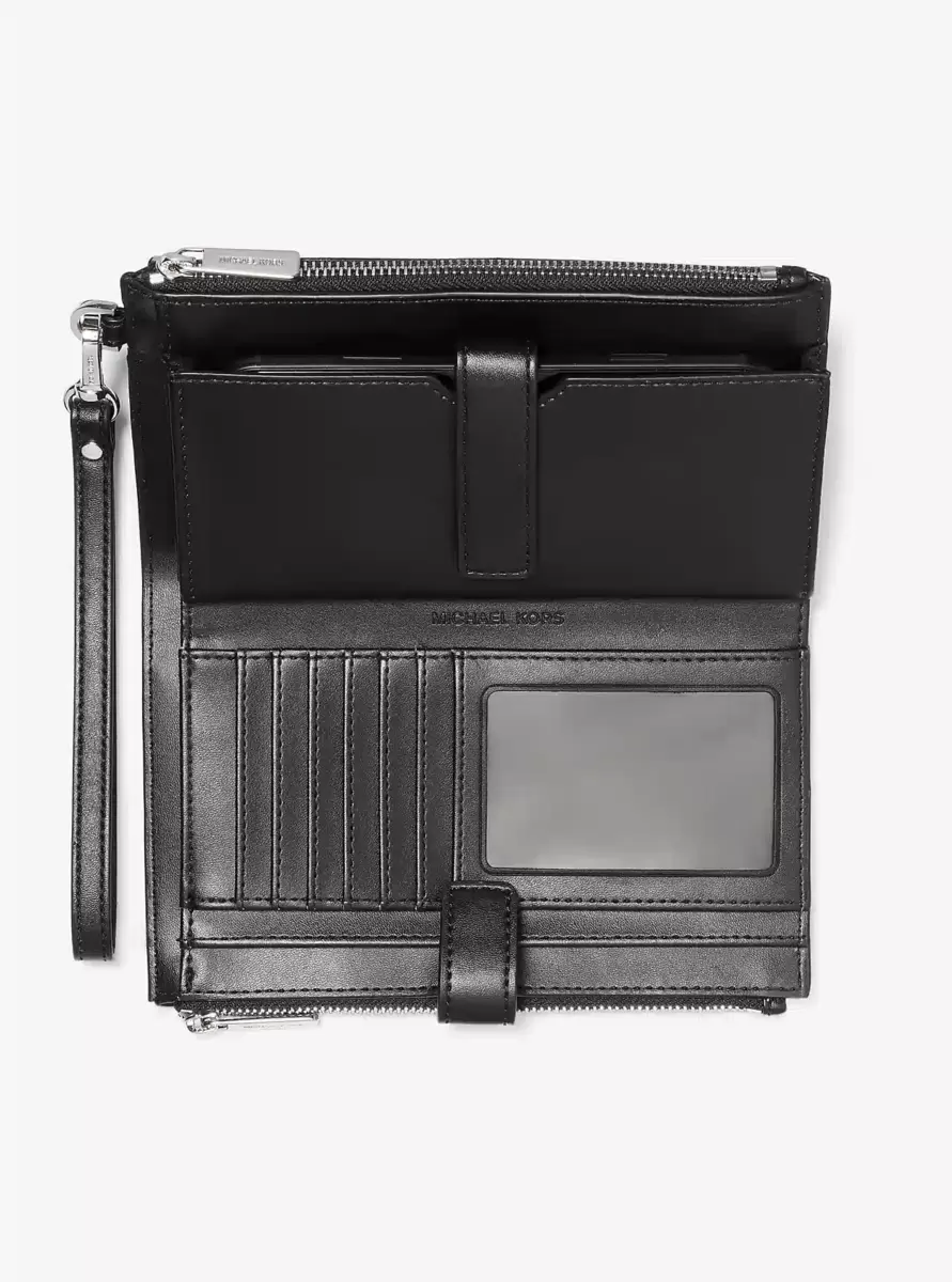 Wykonany z naszego firmowego płótna i skóry, ten portfel ma dwie boczne kieszenie zapinane na suwak, które po rozłożeniu odsłaniają środek z kieszeniami na wszystkie niezbędne rzeczy – od kart kredytowych po smartfon. Odpinany pasek na nadgarstek sprawia, że jest na tyle wszechstronny, że można go nosić samodzielnie lub w torbie.
