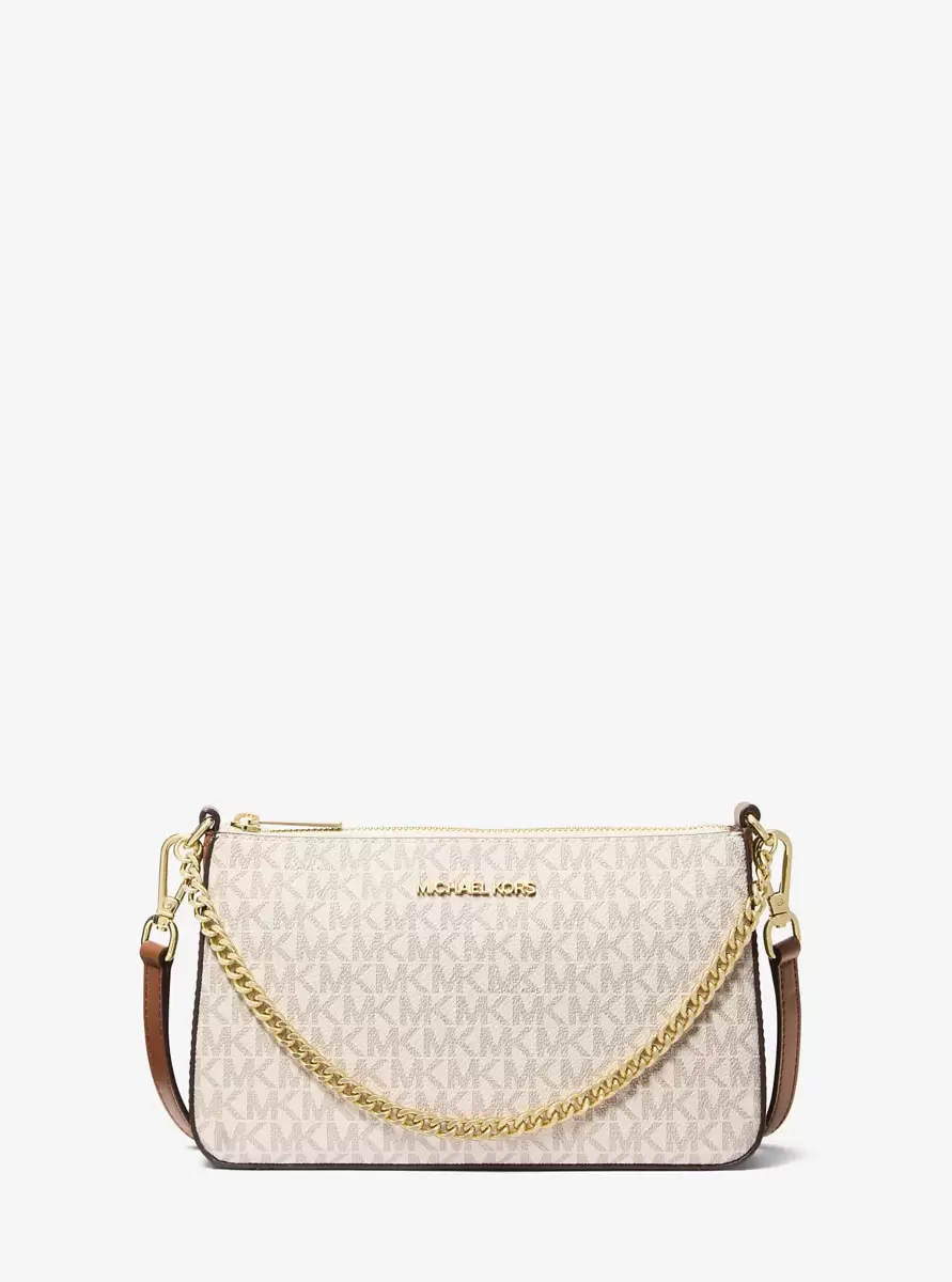 Starannie zapakowany w nasze eleganckie opakowanie, ten zestaw upominkowy z płótna z nadrukiem Signature to duet, którego naprawdę pragnie. Saszetka posiada odpinany pasek na nadgarstek z łańcuszkiem, który zapewnia wszechstronność stylizacji, a po otwarciu odsłania pojemne wnętrze na niezbędne drobiazgi. Wsuń etui na karty w pasujący wzór lub noś je samodzielnie w dni, które wymagają wygody w podróży.