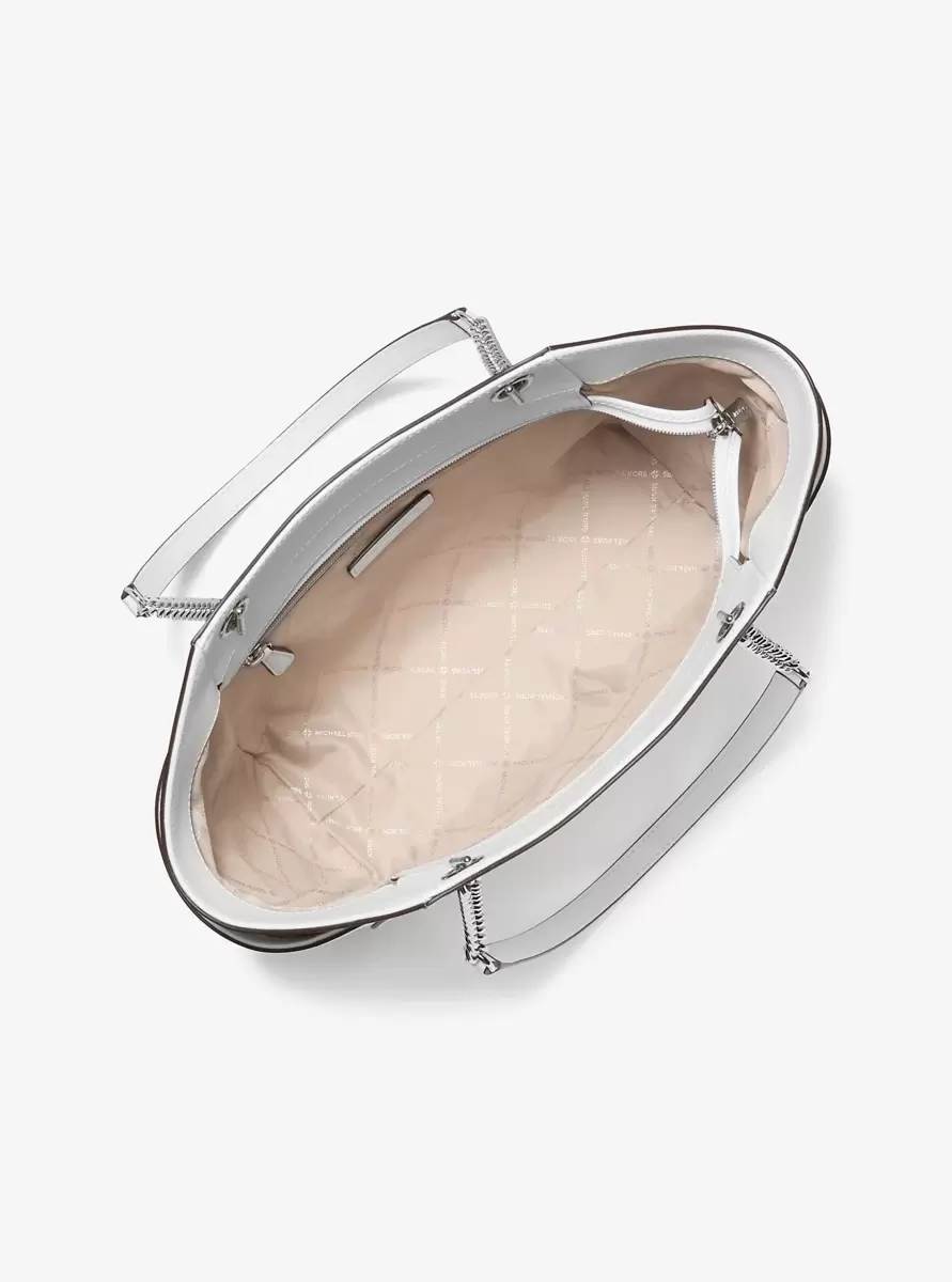 Ta torba na ramię Jet Set, gotowa zabrać Cię wszędzie, jest wykonana ze skóry Saffiano i ozdobiona naszym charakterystycznym napisem „MK”. Usztywniony kształt ma wygodne kieszenie boczne i bezpieczne zapięcie na suwak. Zabierz ją ze sobą, aby zabrać wszystkie niezbędne rzeczy w podróży.
