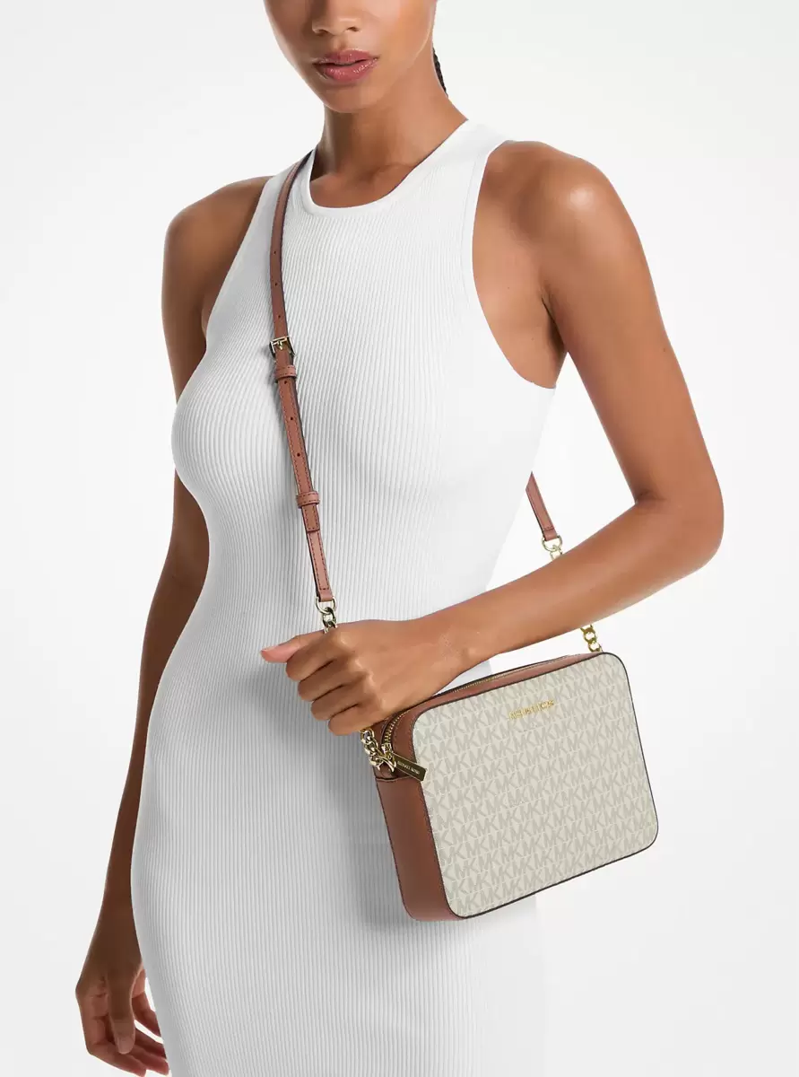 Torba na ramię Jet Set o prostych liniach i płóciennym nadruku z naszym firmowym logo to natychmiastowy klasyk. Złote okucia podkreślają luksusową wrażliwość, a pojemne wnętrze ułatwia organizację najpotrzebniejszych rzeczy.
