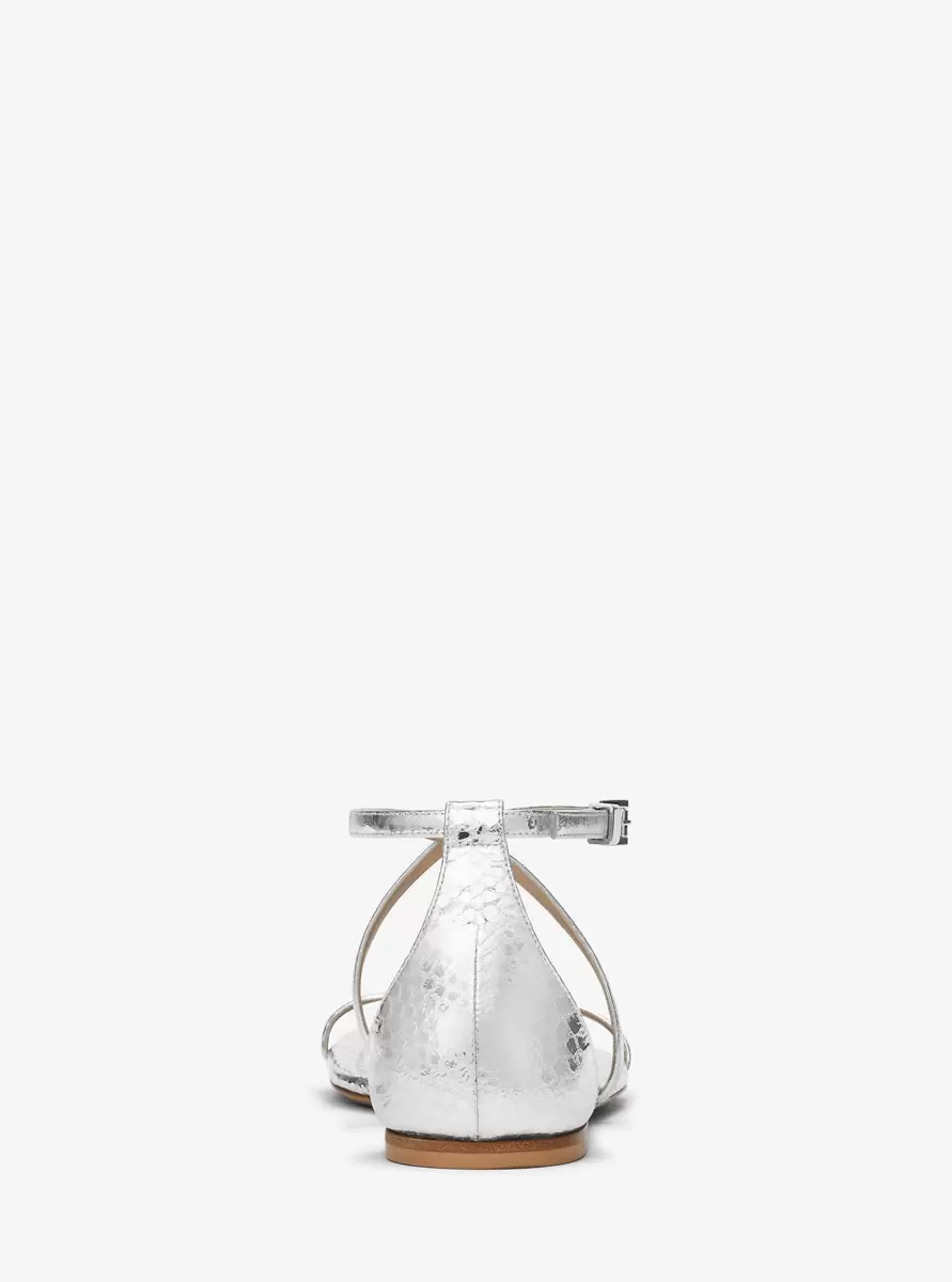 Przedstawiamy Polly: minimalistyczne sandały, które idealnie uzupełnią sezonowe stylizacje na wakacje. Wąskie, skrzyżowane paski z przodu wyróżniają ten model z metalicznej skóry z tłoczonym wzorem węża pytona, a niski obcas zapewnia wygodę noszenia. Połącz go z sukienką typu halter, aby emanować naturalnym urokiem.