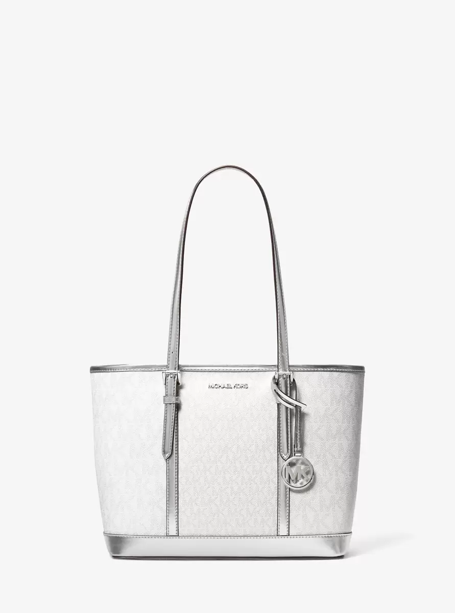 Ta torba Jet Set to idealny towarzysz podróży. Idealny rozmiar, wystarczająco pojemna, aby pomieścić wszystkie niezbędne rzeczy, nie obciążając Cię. Metaliczne płótno z nadrukowanym logo, błyszczące akcenty i srebrny wisiorek tworzą luksusowy akcent, a zapięcie na suwak u góry gwarantuje, że Twoje rzeczy pozostaną na swoim miejscu – zarówno w samolocie, jak i na ziemi.