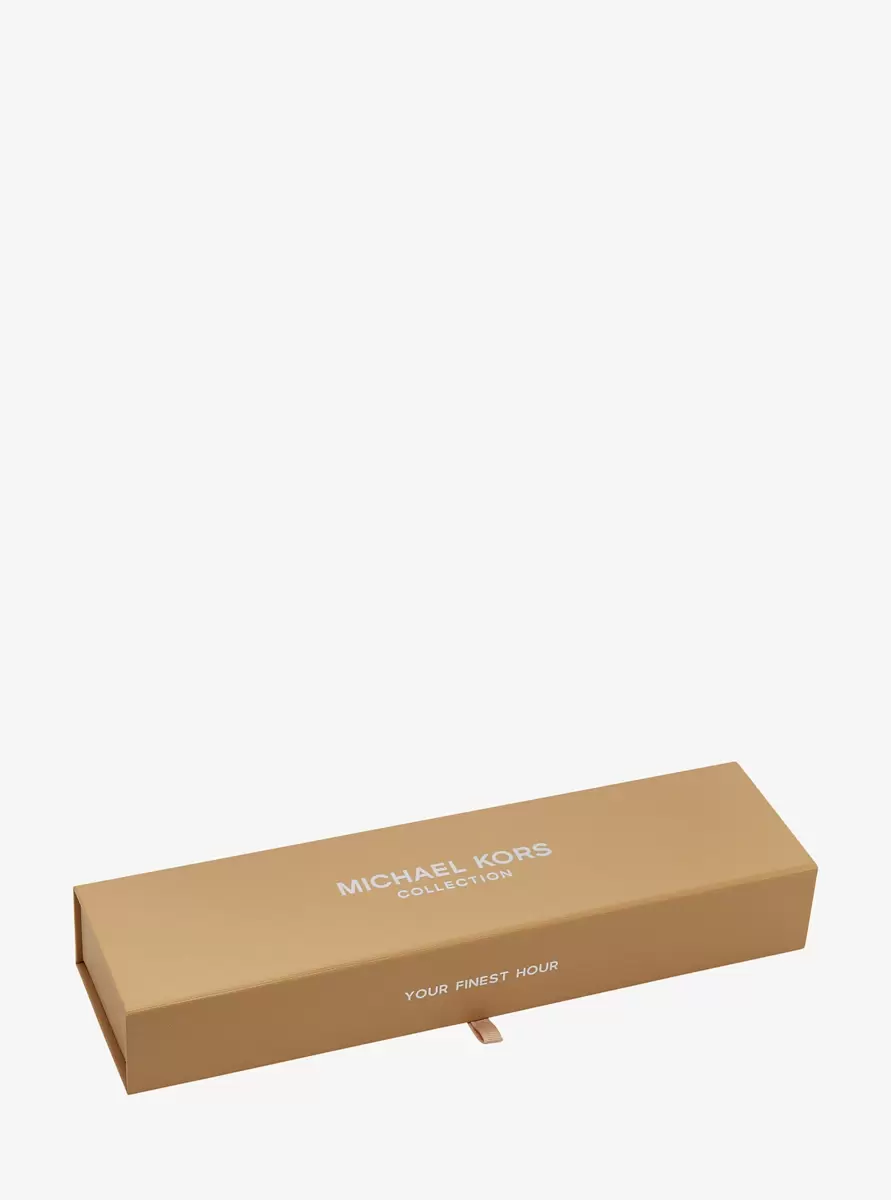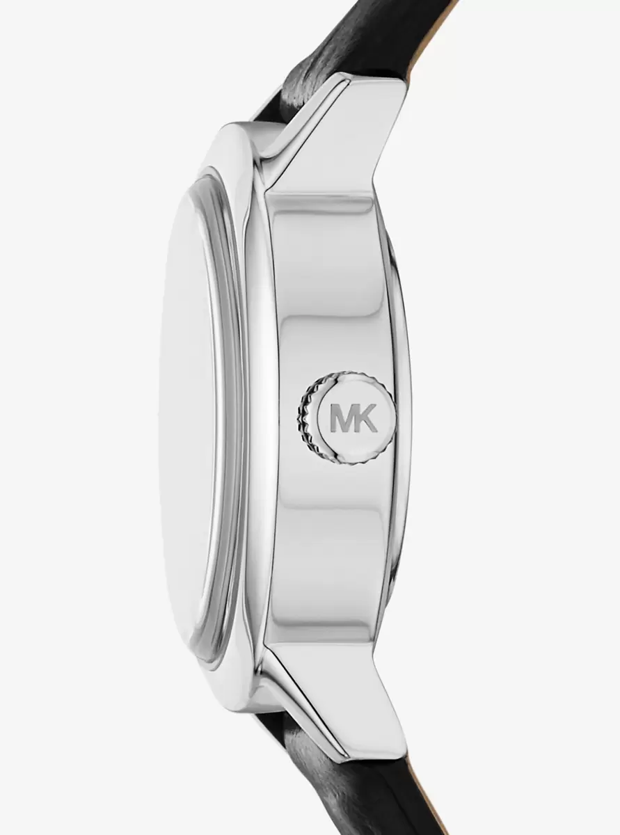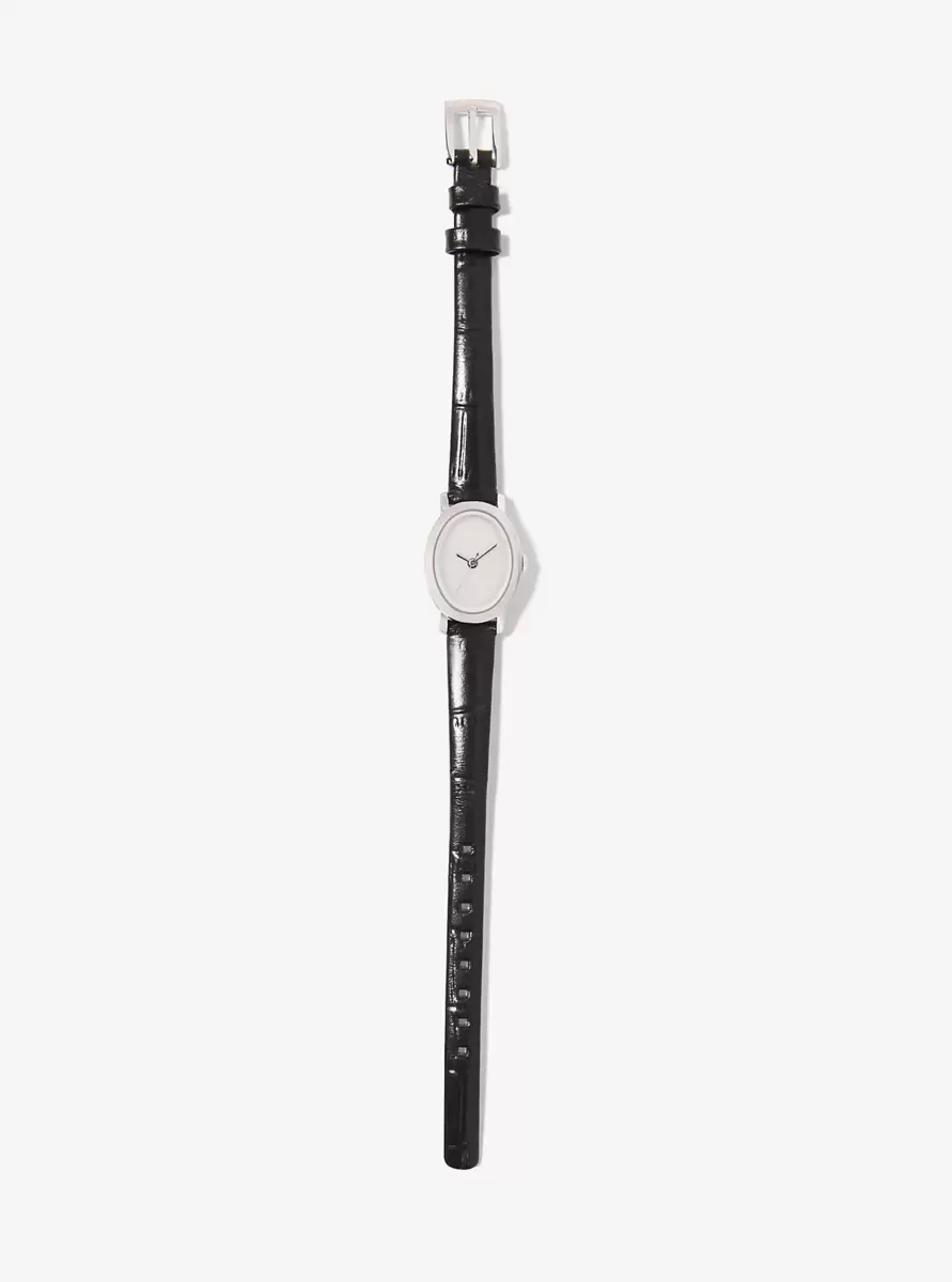 Olśniewający w swojej prostocie, limitowana edycja zegarka Maude przypomina minimalistyczny czasomierz babci Michaela. Ten niewielki zegarek ze stali nierdzewnej ma elegancką, owalną tarczę, która obraca się, odsłaniając unikalny numer identyfikacyjny, oraz skórzany pasek z wytłoczonym wzorem krokodyla, który dodaje mu faktury. Starannie zapakowany w pudełko, z pewnością będzie idealnym prezentem.